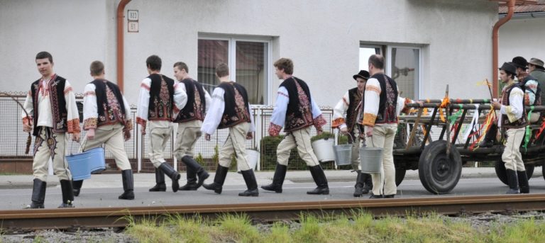 Chlapci v teplanských krojoch idúc na rebriňáku počas tradičnej oblievačky a šibačky na Veľkonočný pondelok v Trenčianskej Teplej v okrese Trenčín. Trenčianska Teplá, 21. apríl 2014. Foto: SITA/Tomáš Somr