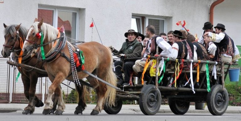 Chlapci v teplanských krojoch na rebriňáku počas tradičnej oblievačky a šibačky na Veľkonočný pondelok v Trenčianskej Teplej v okrese Trenčín. Trenčianska Teplá, 21. apríl 2014. Foto: SITA/Tomáš Somr