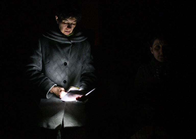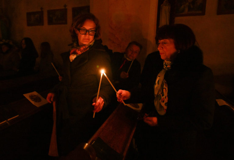 Veriaci sa pripravujú na Veľkonočnú omšu v rámci Bohoslužby svetla - Lucenarium v barokovom rímsko-katolíckom kostole Návštevy Panny Márie u Alžbety z roku 1757 v obci Hrachovište. Hrachovište, okr. Nové Mesto nad Váhom, 30. marec 2024. Foto: SITA/Martin Medňanský