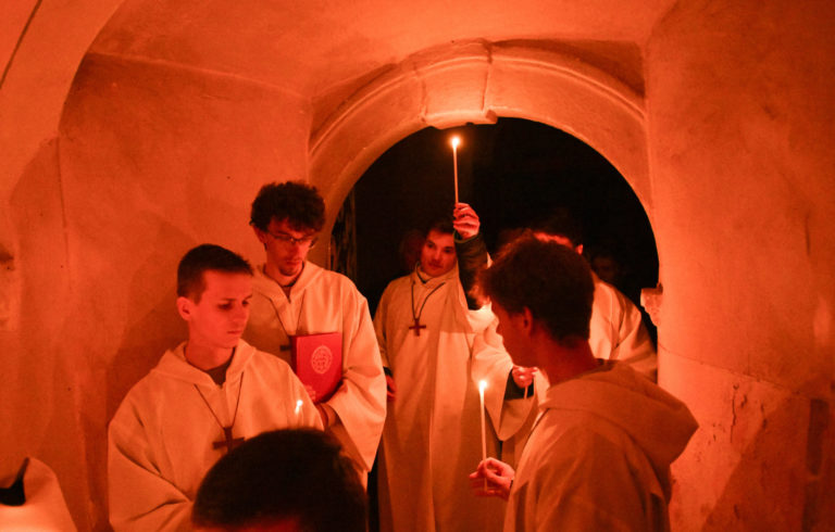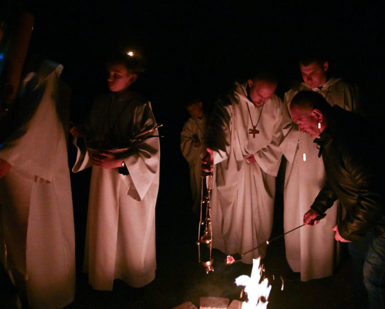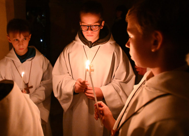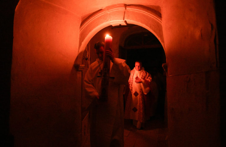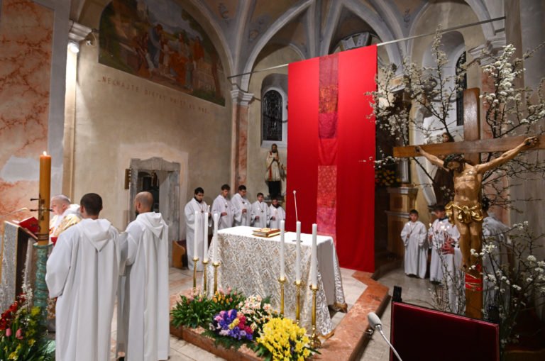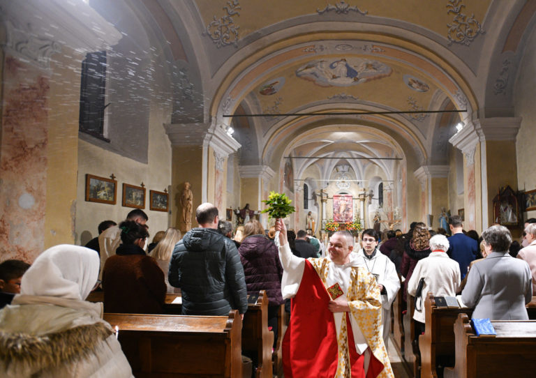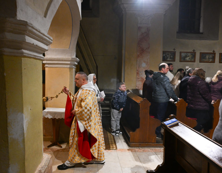 Rímsko-katolícky kňaz Irenej Ciutti (uprostred) počas Veľkonočnej omše v rámci Bohoslužby svetla - Lucenarium v barokovom rímsko-katolíckom kostole Návštevy Panny Márie u Alžbety z roku 1757 v obci Hrachovište. Hrachovište, okr. Nové Mesto nad Váhom, 30. marec 2024. Foto: SITA/Martin Medňanský