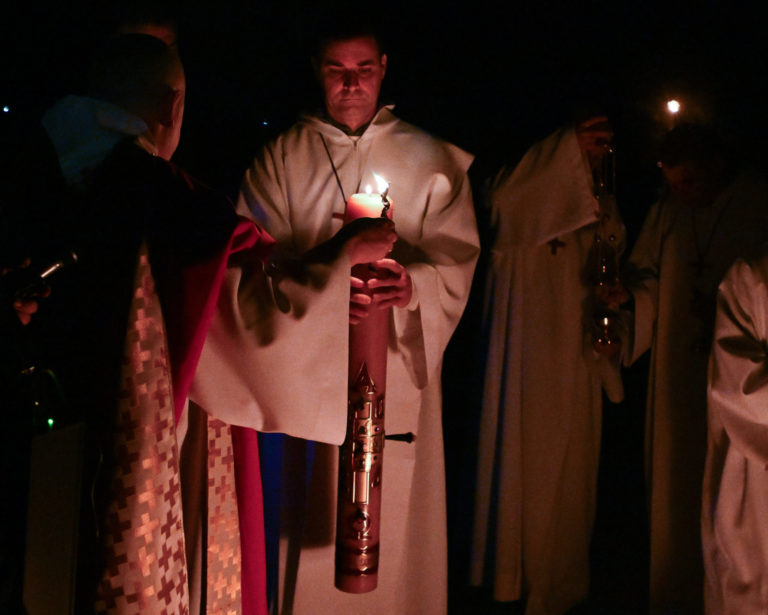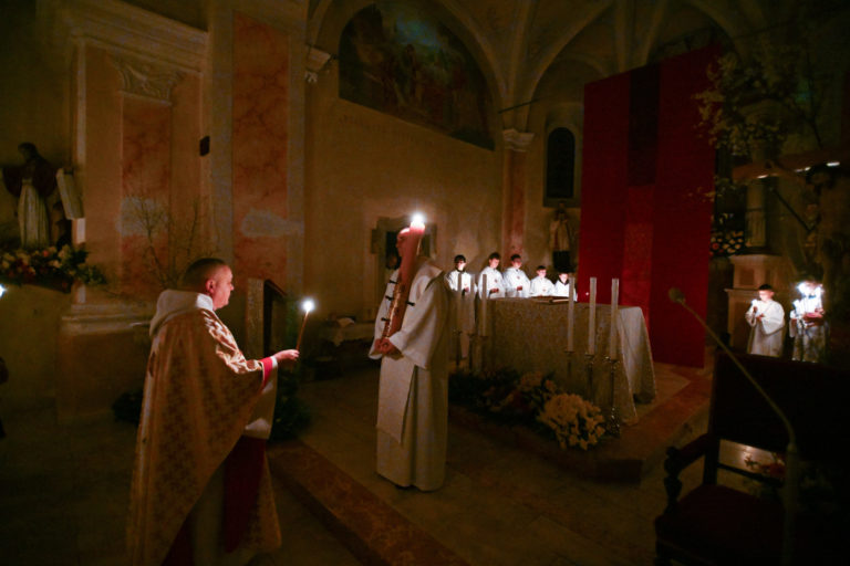 Rímsko-katolícky kňaz Irenej Ciutti počas Veľkonočnej omše v rámci Bohoslužby svetla - Lucenarium v barokovom rímsko-katolíckom kostole Návštevy Panny Márie u Alžbety z roku 1757 v obci Hrachovište. Hrachovište, okr. Nové Mesto nad Váhom, 30. marec 2024. Foto: SITA/Martin Medňanský