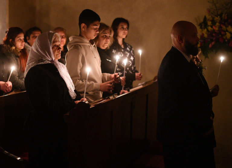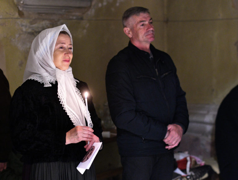 Veriaci počas Veľkonočnej omše v rámci Bohoslužby svetla - Lucenarium v barokovom rímsko-katolíckom kostole Návštevy Panny Márie u Alžbety z roku 1757 v obci Hrachovište. Hrachovište, okr. Nové Mesto nad Váhom, 30. marec 2024. Foto: SITA/Martin Medňanský