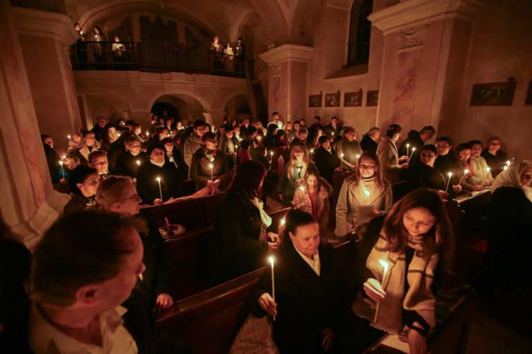Atmosféra počas Veľkonočnej omše v rámci Bohoslužby svetla - Lucenarium v barokovom rímsko-katolíckom kostole Návštevy Panny Márie u Alžbety z roku 1757 v obci Hrachovište. Hrachovište, okr. Nové Mesto nad Váhom, 30. marec 2024. Foto: archívne, SITA/Martin Medňanský