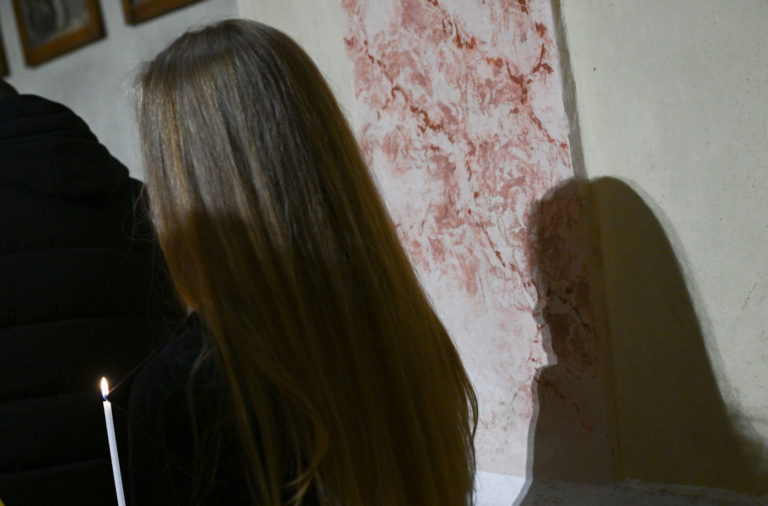 Atmosféra počas Veľkonočnej omše v rámci Bohoslužby svetla - Lucenarium v barokovom rímsko-katolíckom kostole Návštevy Panny Márie u Alžbety z roku 1757 v obci Hrachovište. Hrachovište, okr. Nové Mesto nad Váhom, 30. marec 2024. Foto: SITA/Martin Medňanský