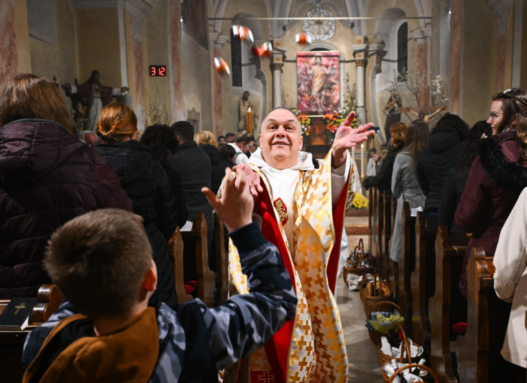 Rímsko-katolícky kňaz Irenej Ciutti rozhadzuje čokoládové veľkonočné vajíčka počas Veľkonočnej omše v rámci Bohoslužby svetla - Lucenarium v barokovom rímsko-katolíckom kostole Návštevy Panny Márie u Alžbety z roku 1757 v obci Hrachovište. Hrachovište, okr. Nové Mesto nad Váhom, 30. marec 2024. Foto: SITA/Martin Medňanský
