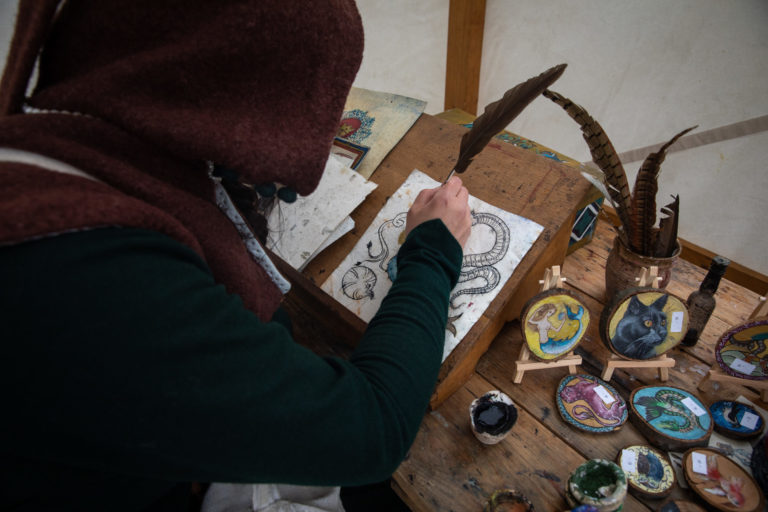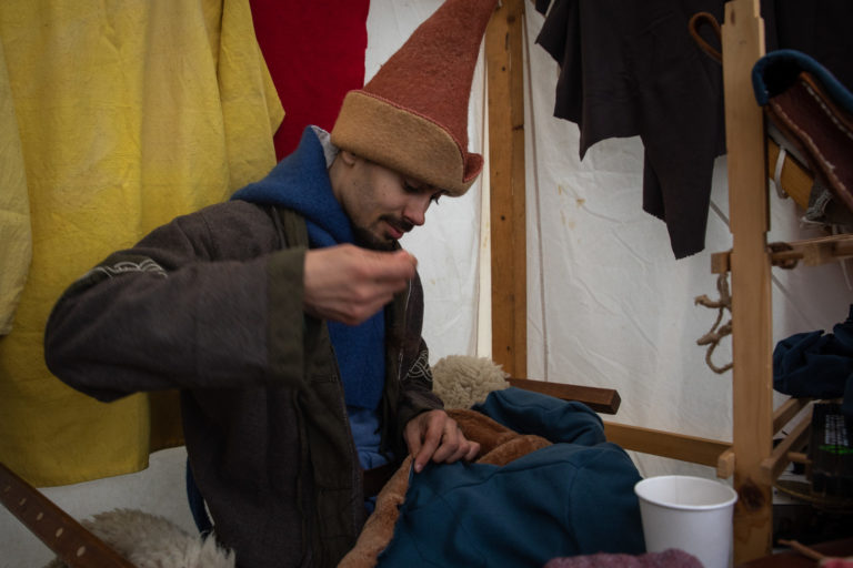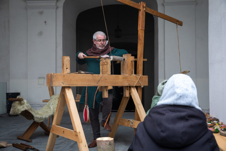 Remeselníci počas Veľkonočných stredovekých remeselných trhov ukazujú tradičnú výrobu pokrmov a výrobkov na nádvorí Bratislavského hradu. Bratislava, 8. apríl 2023. Foto: SITA/Diana Černáková