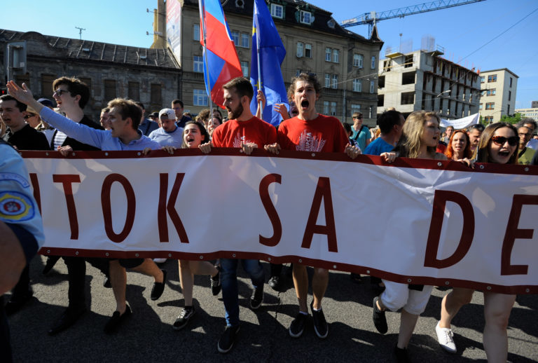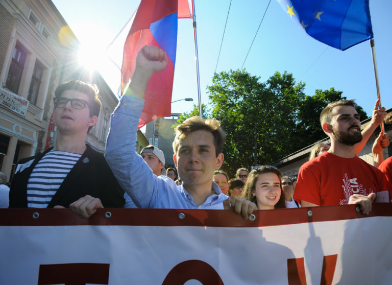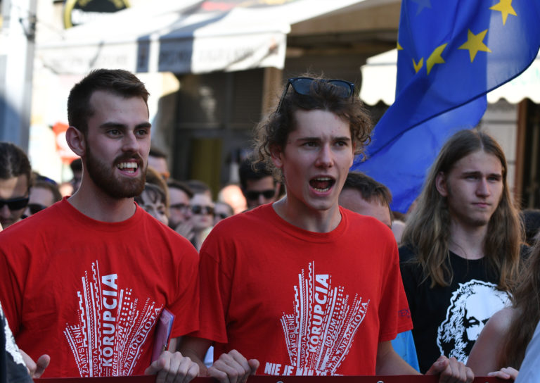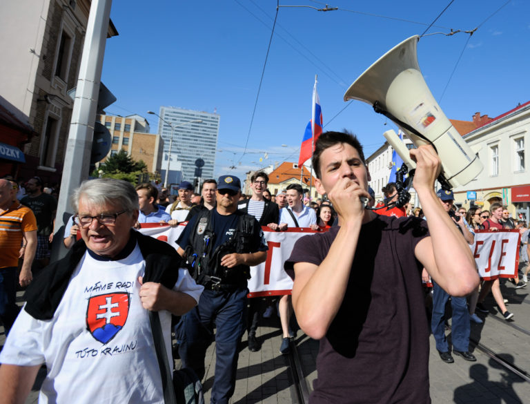 Jeden z organizátorov Veľkého protikorupčného pochodu II. študent Dávid Straka (vľavo). Bratislava, 5. jún 2017. Foto: SITA/Martin Medňanský