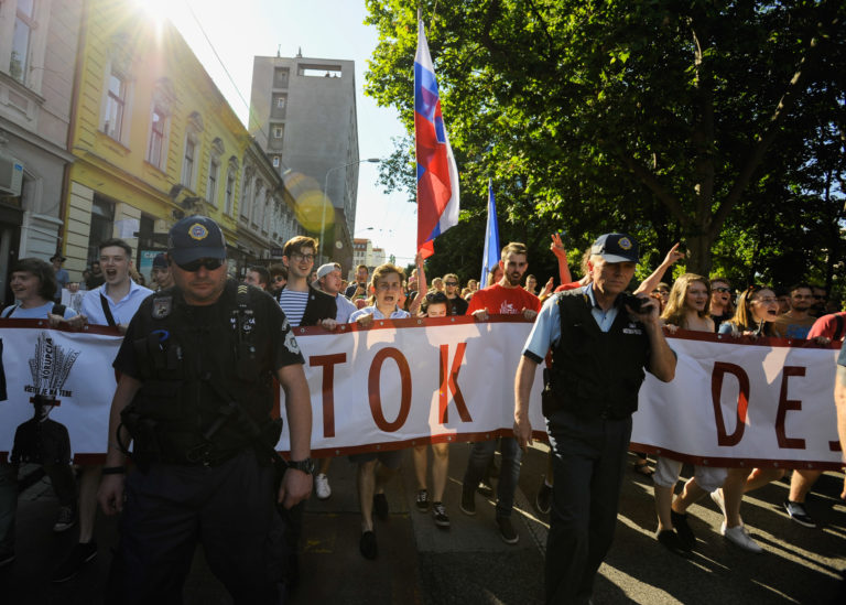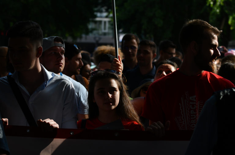 Jeden z organizátorov Veľkého protikorupčného pochodu II. študent Dávid Straka (vpravo). Bratislava, 5. jún 2017. Foto: SITA/Martin Medňanský