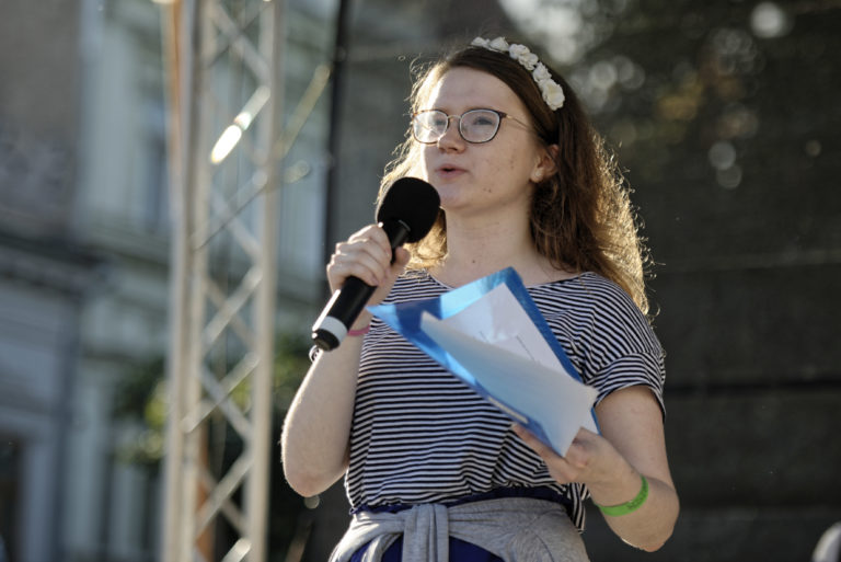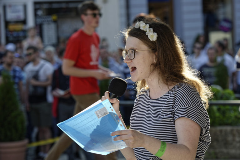 Jedna z organizátorov protestu študentka Karolína Farská sa prihovára účastníkom Veľkého protikorupčného pochodu II. Košice, 5. jún 2017. Foto: SITA/Ivan Fleischer.