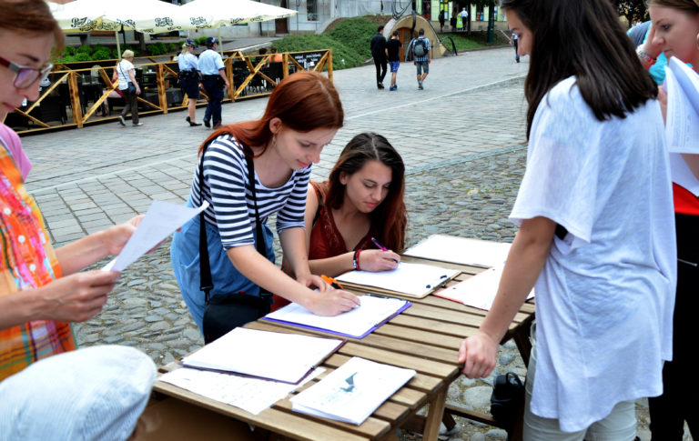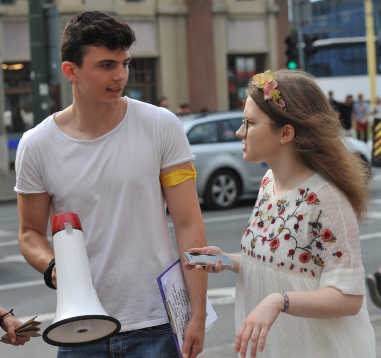 Študenti pozývajú Prešovčanov na účasť vo Veľkom protikorupčnom pochode v Prešove. Prešov, 12. jún 2017. Foto: SITA/Viktor Zamborský