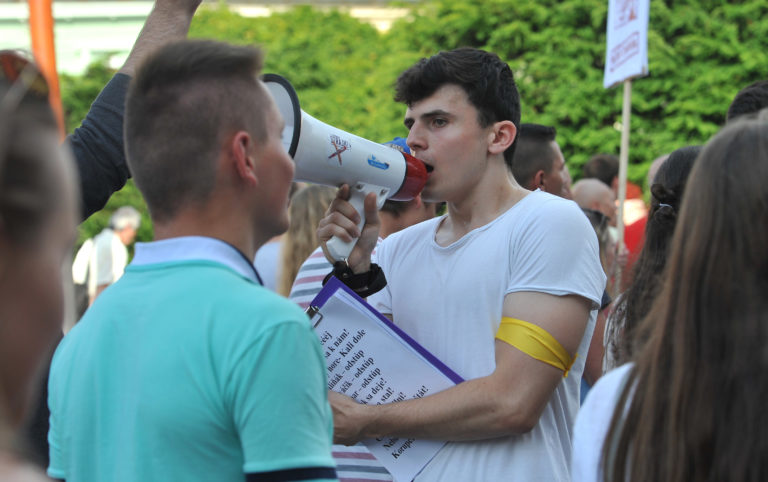 Jeden z organizátorov Veľkého protikorupčného pochodu v Prešove Samuel Kolesár medzi účastníkmi Veľkého protikorupčného pochodu v Prešove. Prešov, 12. jún 2017. Foto: SITA/Viktor Zamborský