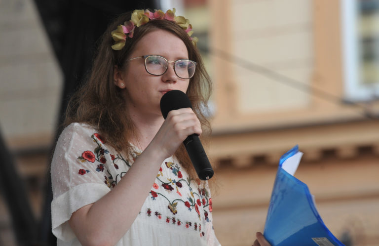 Jedna z organizátorov Veľkého protikorupčného pochodu (VPP) Karolína Farská sa prihovára účastníkom VPP v Prešove. Prešov, 12.jún 2017. Foto: SITA/Viktor Zamborský