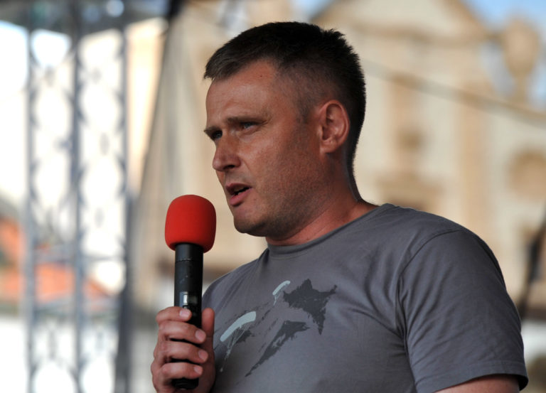 Bývalý policajt Jozef Žaťko sa prihovára účastníkom Veľkého protikorupčného pochodu v Prešove. Prešov, 12. jún 2017. Foto: SITA/Viktor Zamborský