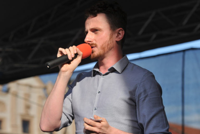 Učiteľ Viktor Pončák sa prihovára účastníkom Veľkého protikorupčného pochodu v Prešove. Prešov, 12.jún 2017. Foto: SITA/Viktor Zamborský