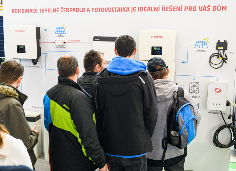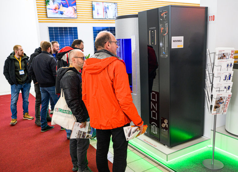 Návštevníci si prezerajú hybridné solárne úložisko českej výroby Slunečnice S3 pre ukladanie prebytkov solárnej (FVE) energie do vody a do batérií počas 22. ročníka Medzinárodného odborného veľtrhu vykurovacej, ventilačnej, klimatizačnej, meracej, regulačnej, sanitárnej a ekologickej techniky Aquatherm Nitra v národnom výstavisku Agrokomplex v Nitre. Nitra, 7. február 2023. Foto: SITA/Martin Havran