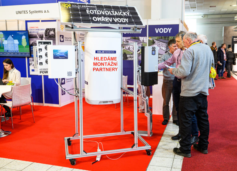 Systém Solar kerberos, slúžiaci k úspornému ohrevu vody počas 22. ročníka Medzinárodného odborného veľtrhu vykurovacej, ventilačnej, klimatizačnej, meracej, regulačnej, sanitárnej a ekologickej techniky Aquatherm Nitra v národnom výstavisku Agrokomplex v Nitre. Nitra, 7. február 2023. Foto: SITA/Martin Havran