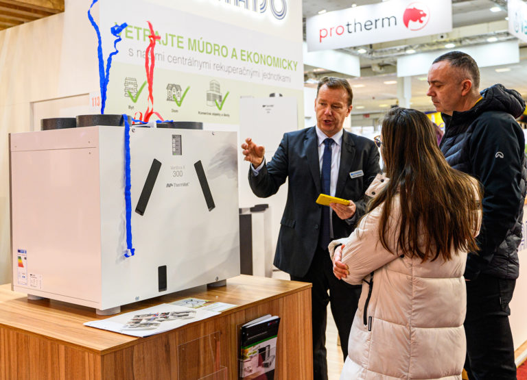 Návštevníci si prezerajú Centrálnu rekuperačnú jednotku Ventbox 300, ktorá zaisťuje riadené vetranie s rekuperáciou vzduchu, odvetranie radónu a odstránenie vlhkosti počas 22. ročníka Medzinárodného odborného veľtrhu vykurovacej, ventilačnej, klimatizačnej, meracej, regulačnej, sanitárnej a ekologickej techniky Aquatherm Nitra v národnom výstavisku Agrokomplex v Nitre. Nitra, 7. február 2023. Foto: SITA/Martin Havran