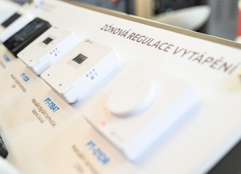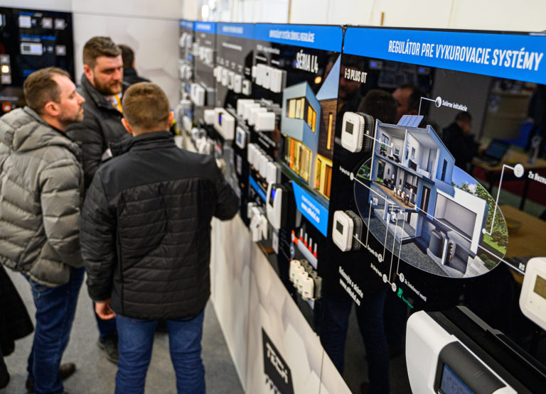Termostaty určené k zónovej regulácii vykurovania počas 22. ročníka Medzinárodného odborného veľtrhu vykurovacej, ventilačnej, klimatizačnej, meracej, regulačnej, sanitárnej a ekologickej techniky Aquatherm Nitra v národnom výstavisku Agrokomplex v Nitre. Nitra, 7. február 2023. Foto: SITA/Martin Havran
