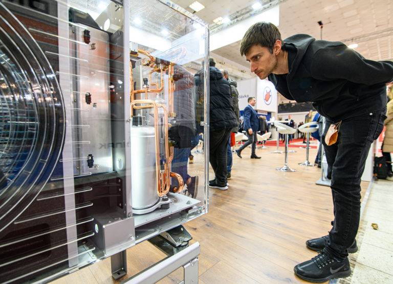 Návštevník si prezerá tepelné čerpadlo Vaillant aroTHERM plus počas 22. ročníka Medzinárodného odborného veľtrhu vykurovacej, ventilačnej, klimatizačnej, meracej, regulačnej, sanitárnej a ekologickej techniky Aquatherm Nitra v národnom výstavisku Agrokomplex v Nitre. Nitra, 7. február 2023. Foto: SITA/Martin Havran