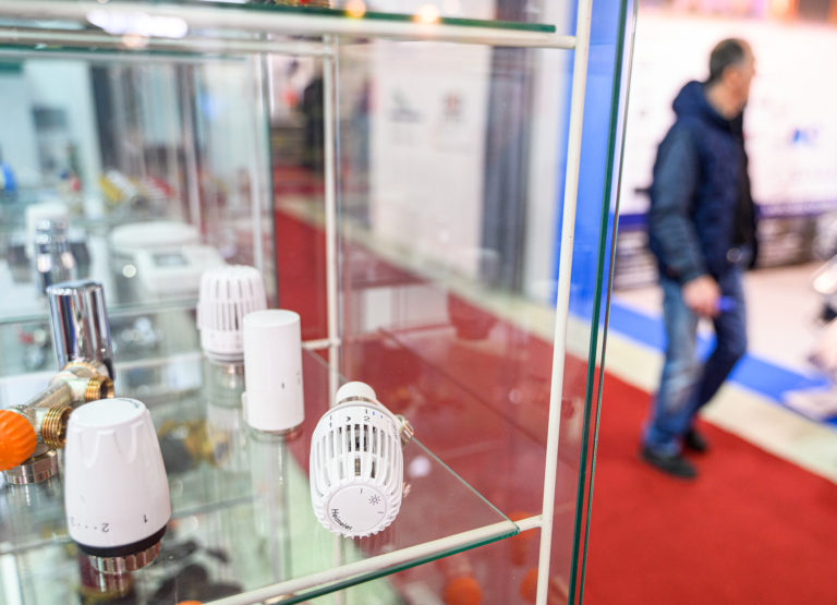 Termostatické hlavice na radiátory počas 22. ročníka Medzinárodného odborného veľtrhu vykurovacej, ventilačnej, klimatizačnej, meracej, regulačnej, sanitárnej a ekologickej techniky Aquatherm Nitra v národnom výstavisku Agrokomplex v Nitre. Nitra, 7. február 2023. Foto: SITA/Martin Havran