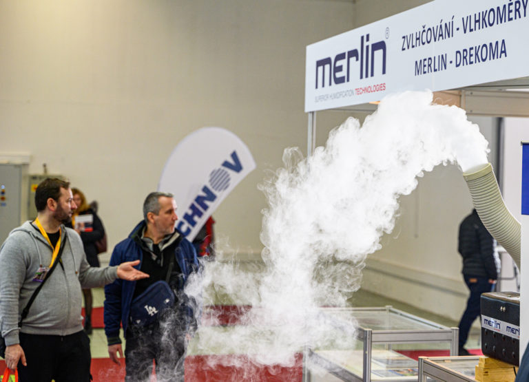 Systém zvlhčovania vzduchu Merlin Technology vypúšťa prúd pary počas 22. ročníka Medzinárodného odborného veľtrhu vykurovacej, ventilačnej, klimatizačnej, meracej, regulačnej, sanitárnej a ekologickej techniky Aquatherm Nitra v národnom výstavisku Agrokomplex v Nitre. Nitra, 7. február 2023. Foto: SITA/Martin Havran