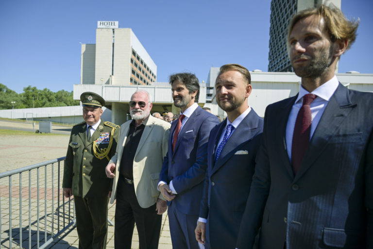 Zľava: Náčelník Generálneho štábu Ozbrojených síl SR Daniel Zmeko, bývalý prezident SR Ivan Gašparovič, minister obrany SR Robert Kaliňák, minister vnútra SR Matúš Šutaj Eštok a Alexander Rozin mladší počas otvorenia medzinárodého veľtrhu obrannej a bezpečnostnej techniky IDEB Defence&Security v bratislavskej Inchebe. Bratislava, 14. máj 2024. Foto: SITA/Milan Illík