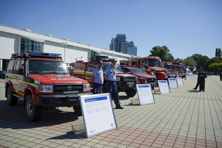 Vystavené hasičské vozidlá počas otvorenia medzinárodého veľtrhu obrannej a bezpečnostnej techniky IDEB Defence&Security v bratislavskej Inchebe. Bratislava, 14. máj 2024. Foto: SITA/Milan Illík