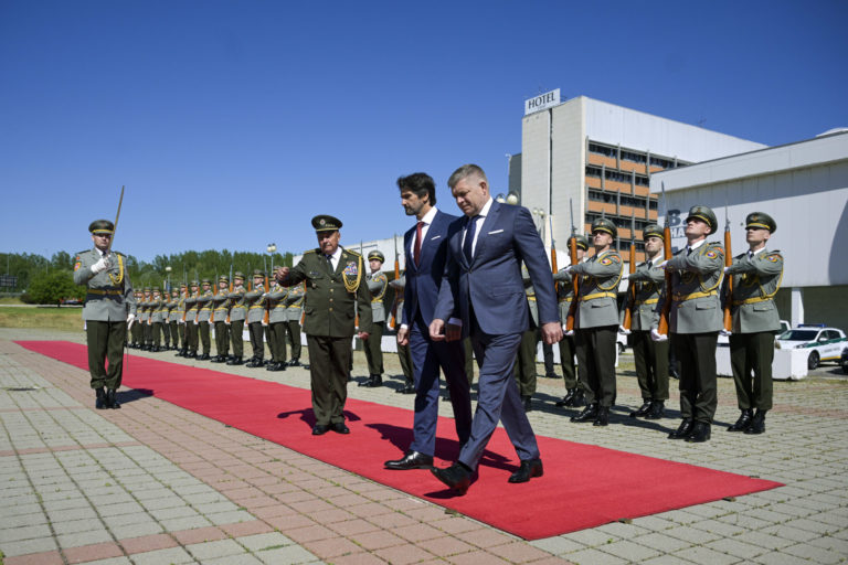 Zľava: Minister obrany SR Robert Kaliňák, premiér SR Robert Fico a náčelník Generálneho štábu Ozbrojených síl SR Daniel Zmeko počas otvorenia medzinárodého veľtrhu obrannej a bezpečnostnej techniky IDEB Defence&Security v bratislavskej Inchebe. Bratislava, 14. máj 2024. Foto: SITA/Milan Illík