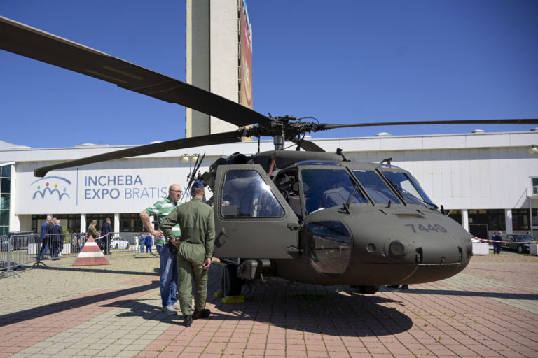 Vrtuľník UH-60M Black Hawk počas otvorenia medzinárodého veľtrhu obrannej a bezpečnostnej techniky IDEB Defence&Security v bratislavskej Inchebe. Bratislava, 14. máj 2024. Foto: SITA/Milan Illík