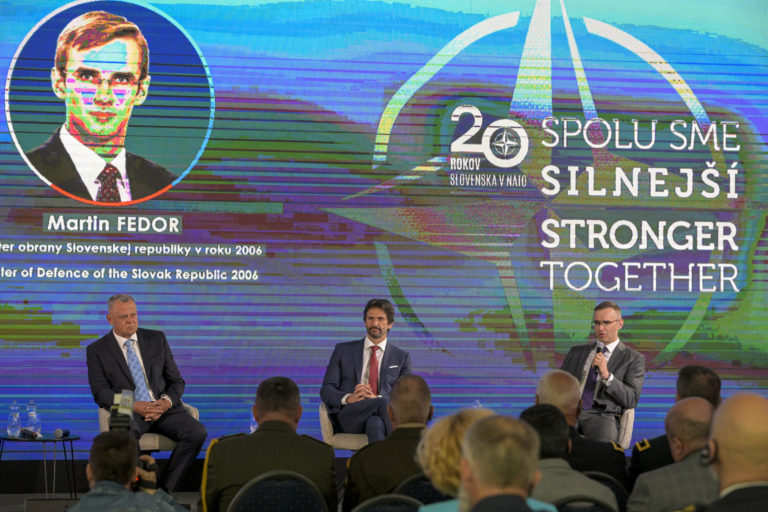 Zľava: Náčelník Generálneho štábu Ozbrojených síl SR Daniel Zmeko, minister obrany SR Robert Kaliňák minister vnútra SR Matúš Šutaj Eštok a Alexander Rozin mladší počas otvorenia medzinárodého veľtrhu obrannej a bezpečnostnej techniky IDEB Defence&Security v bratislavskej Inchebe. Bratislava, 14. máj 2024. Foto: SITA/Milan Illík