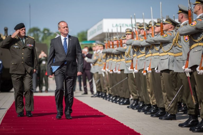 Zľava: Náčelník Generálneho štábu OS SR Milan Maxim a minister obrany Peter Gajdoš počas otvorenia 6. ročníka veľtrhu obrannej techniky IDEB 2016. Bratislava, 10. máj 2016. Foto: SITA/Marko Erd
