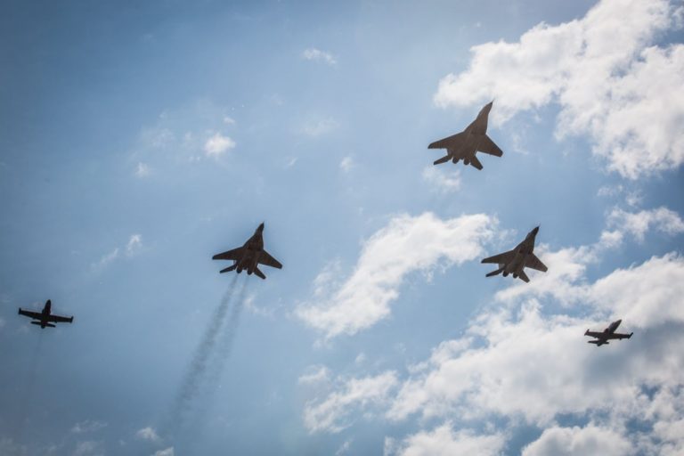 Prelet lietadiel Vzdušných síl OS SR počas otvorenia 6. ročníka veľtrhu obrannej techniky IDEB 2016. Bratislava, 10. máj 2016. Foto: SITA/Marko Erd