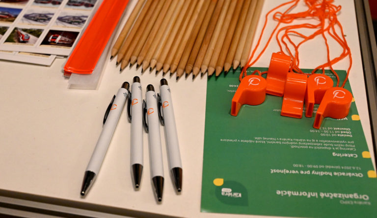 Reklamné predmety v stánku Železničnej spoločnosti Slovensko (ZSSK) počas veľtrhu práce Kariéra EXPO Košice v Spoločenskom pavilóne v Košiciach. Košice, 12. jún 2024. Foto: SITA/Viktor Zamborský