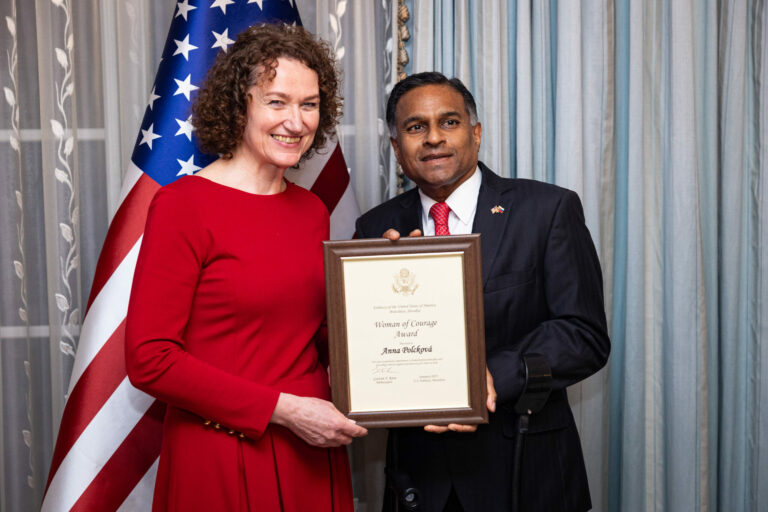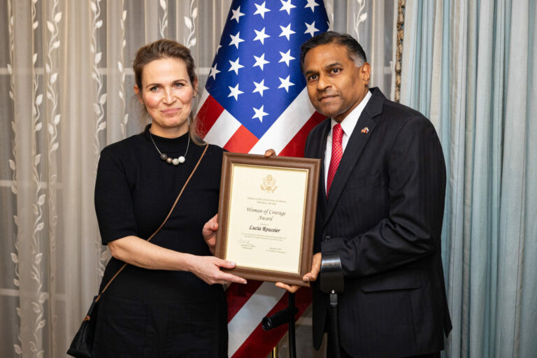 Zľava: Humanitárna pracovníčka a odborníčka na verejné zdravie Lucia Roussier ocenená Cenou Žena s odvahou a veľvyslanec USA na Slovensku Gautam Rana počas odovzdávania cien za ochranu ľudských práv za rok 2024. Bratislava, 15. január 2025. Foto: SITA/Jana Birošová