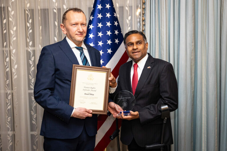 Zľava: Riaditeľ neziskovej organizácie Cesta von Pavel Hrica ocenený Cenou Ochranca ľudských práv a veľvyslanec USA na Slovensku Gautam Rana počas odovzdávania cien za ochranu ľudských práv za rok 2024. Bratislava, 15. január 2025. Foto: SITA/Jana Birošová