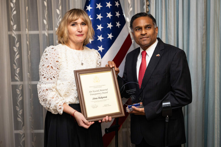Zľava: Bývalá novinárka, analytička a zástupkyňa riaditeľky nadácie Zastavme korupciu Xénia Makarová ocenená Cenou Jána Kuciaka za transparentnosť a veľvyslanec USA na Slovensku Gautam Rana počas odovzdávania cien za ochranu ľudských práv za rok 2024. Bratislava, 15. január 2025. Foto: SITA/Jana Birošová