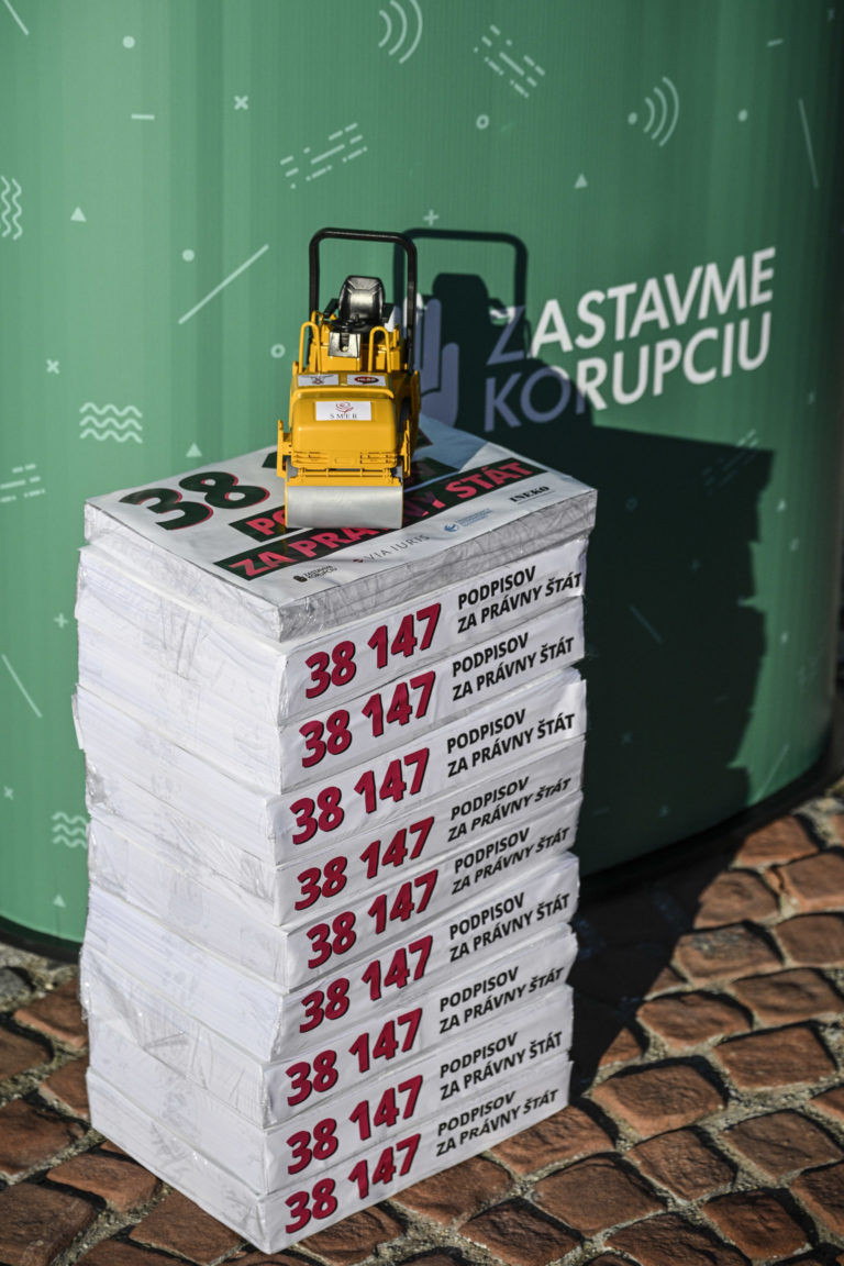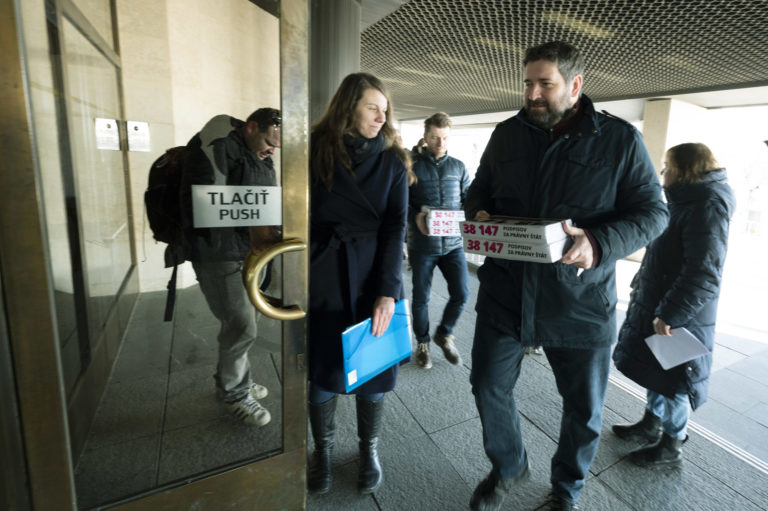 Podpisy občanov Slovenska počas brífingu organizácií Via Iuris, Nadácie Zastavme korupciu, Transparency International Slovensko a INEKO pred parlamentom na tému: „38 147 podpisov za právny štát” a odovzdali verejnú výzvu predsedovi NR SR Petrovi Pellegrinimu do Kancelárie Národnej rady SR. Bratislava, 10. január 2024. Foto: SITA/Milan Illík