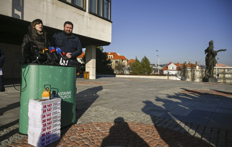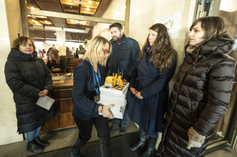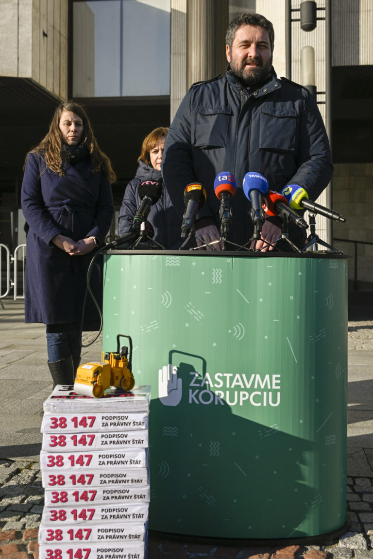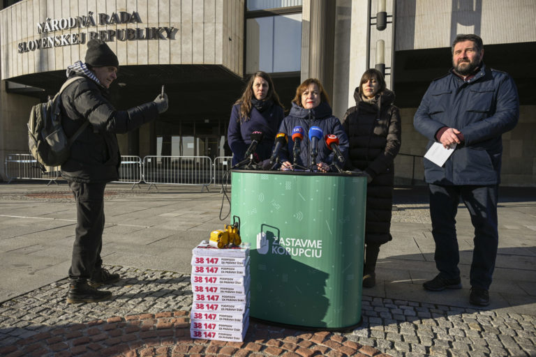 Brífing organizácií Via Iuris, Nadácie Zastavme korupciu, Transparency International Slovensko a INEKO pred parlamentom na tému: „38 147 podpisov za právny štát” a odovzdali verejnú výzvu predsedovi NR SR Petrovi Pellegrinimu do Kancelárie Národnej rady SR. Bratislava, 10. január 2024. Foto: SITA/Milan Illík