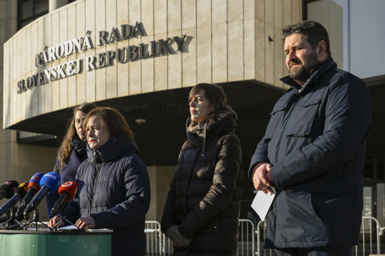Zľava: Zuzana Petková (Nadácie Zastavme korupciu), Dušan Zachar (Ineko), Katarína Batková (Via Iuris) a Martina Hilbertová (Transparency International Slovensko) počas brífingu organizácií Via Iuris, Nadácie Zastavme korupciu, Transparency International Slovensko a INEKO pred parlamentom na tému: „38 147 podpisov za právny štát” a odovzdali verejnú výzvu predsedovi NR SR Petrovi Pellegrinimu do Kancelárie Národnej rady SR. Bratislava, 10. január 2024. Foto: SITA/Milan Illík