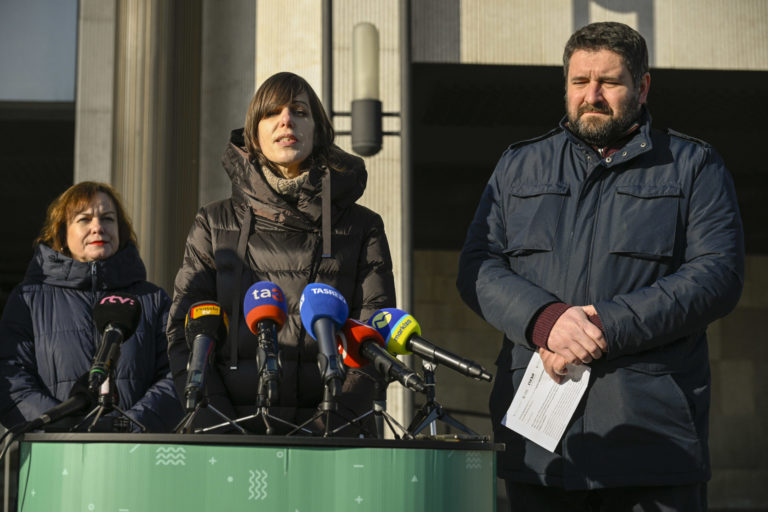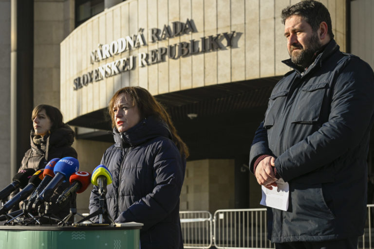 Zľava: Zuzana Petková (Nadácie Zastavme korupciu), Katarína Batková (Via Iuris) a Dušan Zachar (Ineko) počas brífingu organizácií Via Iuris, Nadácie Zastavme korupciu, Transparency International Slovensko a INEKO pred parlamentom na tému: „38 147 podpisov za právny štát” a odovzdali verejnú výzvu predsedovi NR SR Petrovi Pellegrinimu do Kancelárie Národnej rady SR. Bratislava, 10. január 2024. Foto: SITA/Milan Illík