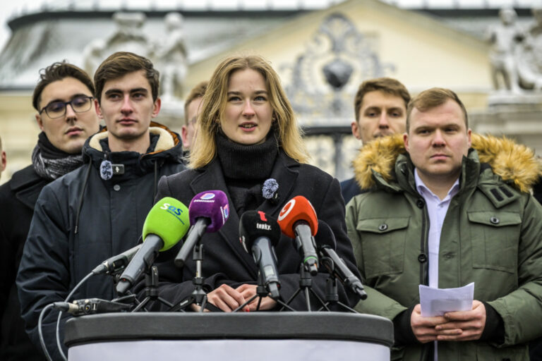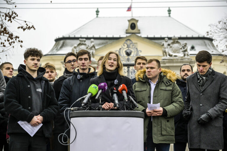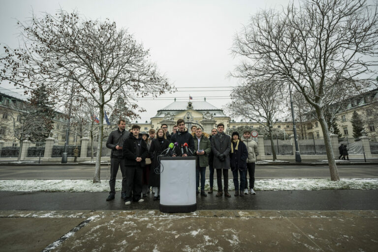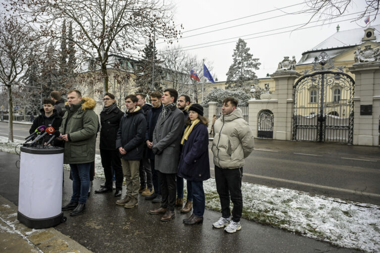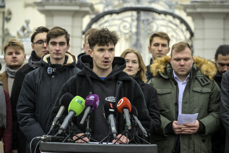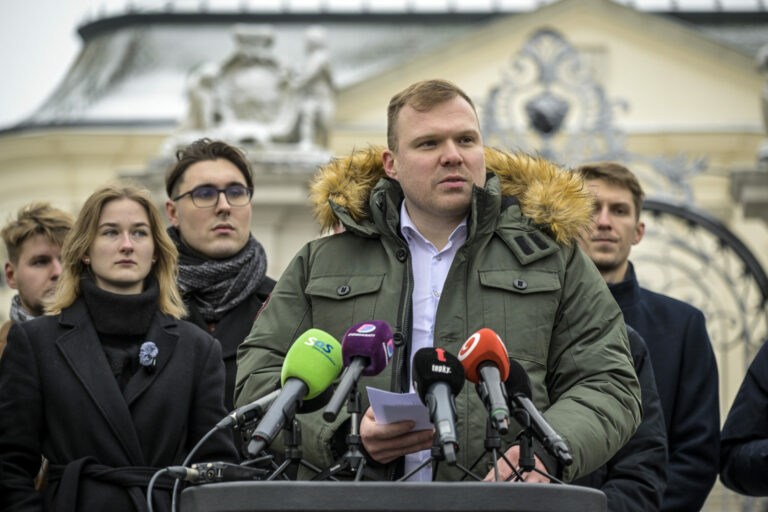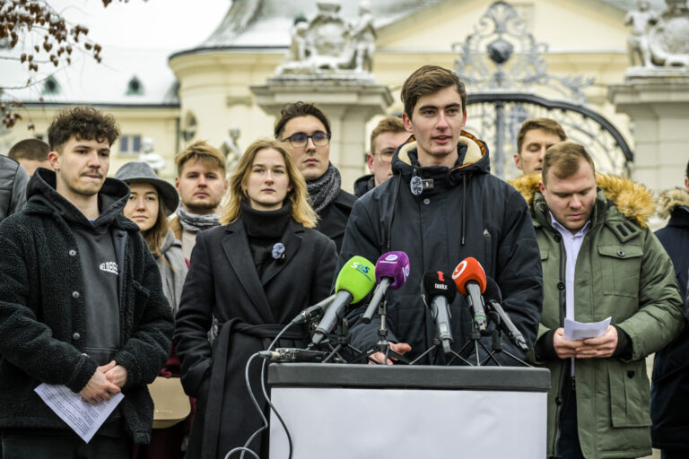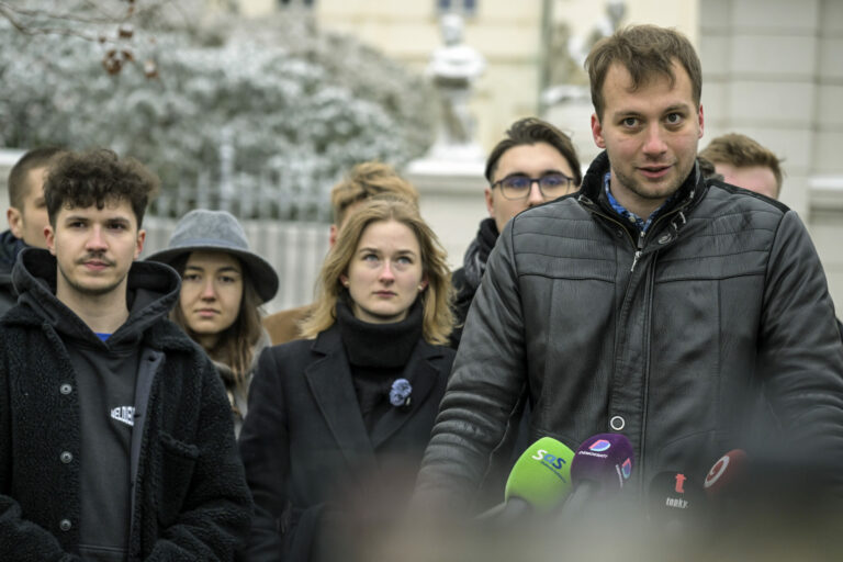 Podpredseda Kresťanskodemokratickej mládeže Slovenska (KDMS) Erik Nikerle (vpravo) počas tlačovej besedy politických mládežníckych organizácií na tému: Tlak na mladých ľudí dosiahol vrchol: Vláda sa nemôže ďalej vyhýbať odpovediam pred Úradom vlády v Bratislave. Bratislava, 20. január 2025. Foto: SITA/Milan Illík