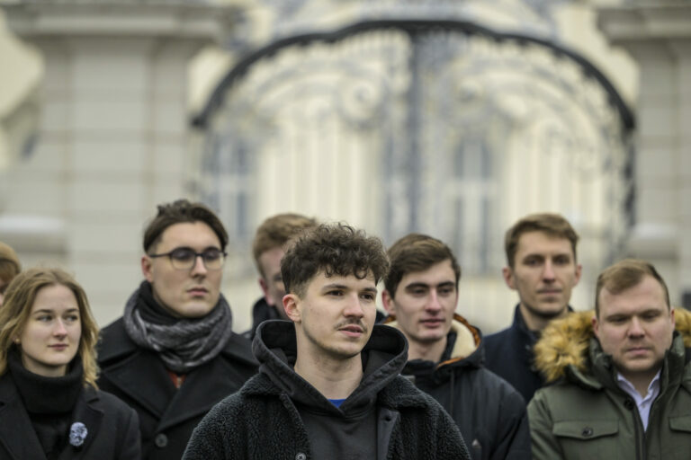 Predseda organizácie Mladí Demokrati - Generácie D Jakub Kubík (v popredí) počas tlačovej besedy politických mládežníckych organizácií na tému: Tlak na mladých ľudí dosiahol vrchol: Vláda sa nemôže ďalej vyhýbať odpovediam pred Úradom vlády v Bratislave. Bratislava, 20. január 2025. Foto: SITA/Milan Illík