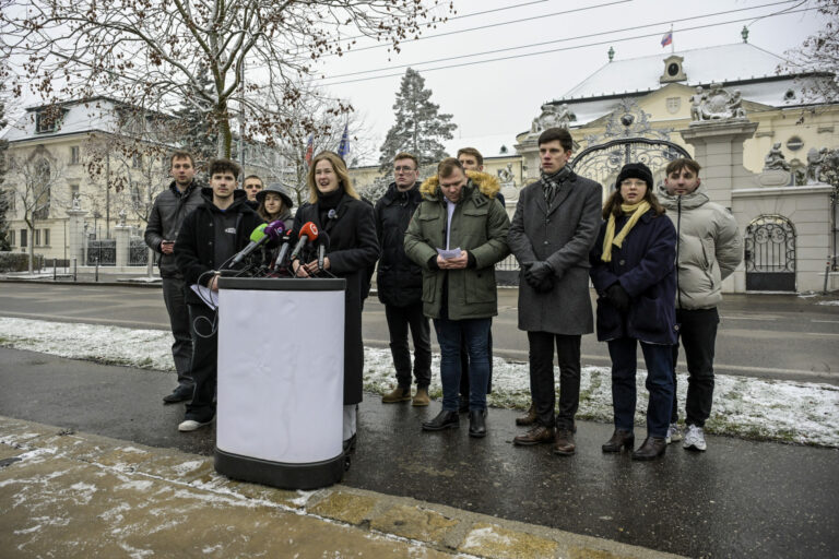 Predseda organizácie Mladí SaSkári Nikolas Prejsa (uprostred) počas tlačovej besedy politických mládežníckych organizácií na tému: Tlak na mladých ľudí dosiahol vrchol: Vláda sa nemôže ďalej vyhýbať odpovediam pred Úradom vlády v Bratislave. Bratislava, 20. január 2025. Foto: SITA/Milan Illík