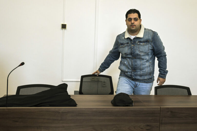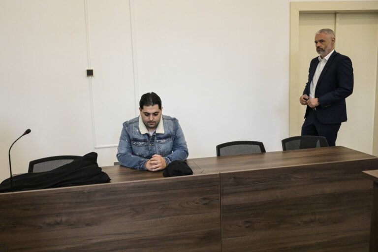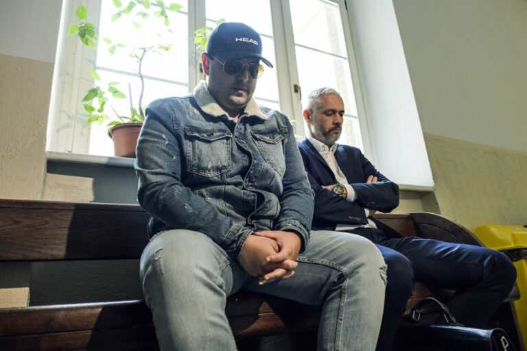 Sprava: Advokát Adrian Šándorčin a René H., obvinený zo sprenevery peňazí na miestnom úrade (MiÚ) v bratislavskej Petržalke (druhý zľava) počas verejného zasadnutia na Krajskom súde v Bratislave. Bratislava, 26. máj 2025. Foto: SITA/Milan Illík.