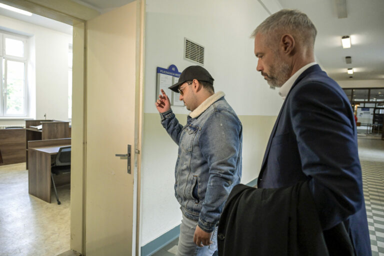 Sprava: Advokát Adrian Šandorčin a René H., obvinený zo sprenevery peňazí na miestnom úrade (MiÚ) v bratislavskej Petržalke (druhý zľava) počas verejného zasadnutia na Krajskom súde v Bratislave. Bratislava, 26. máj 2025. Foto: SITA/Milan Illík