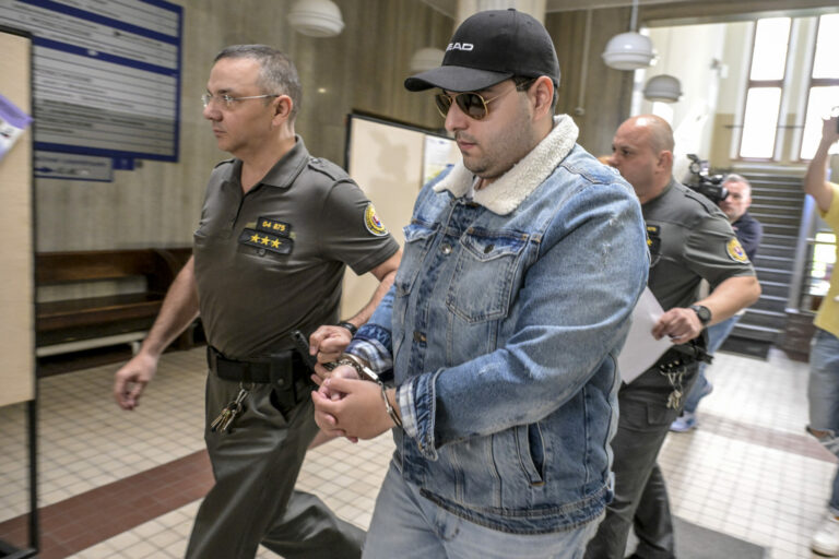 René H., obvinený zo sprenevery peňazí na miestnom úrade (MiÚ) v bratislavskej Petržalke (uprostred), sprevádzaný policajnou eskortou s putami na rukách po verejnom zasadnutí na Krajskom súde v Bratislave. Bratislava, 26. máj 2025. Foto: SITA/Milan Illík.