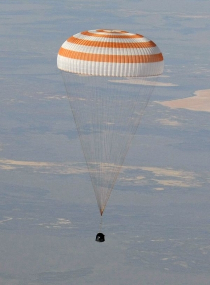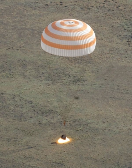 Vesmírna kapsula Sojuzu TMA-20 pristáva pri kazašskom meste Džezkazgan 24. mája 2011. Foto: SITA/AP