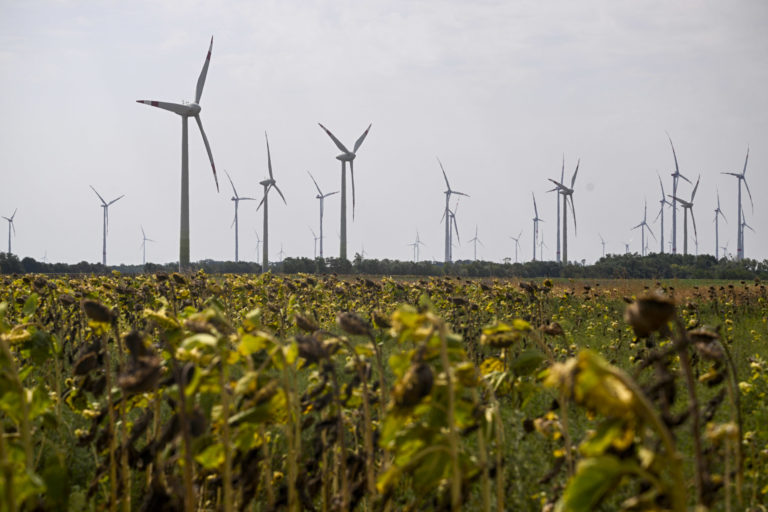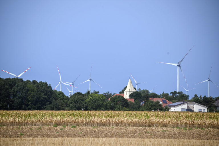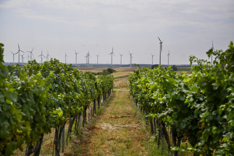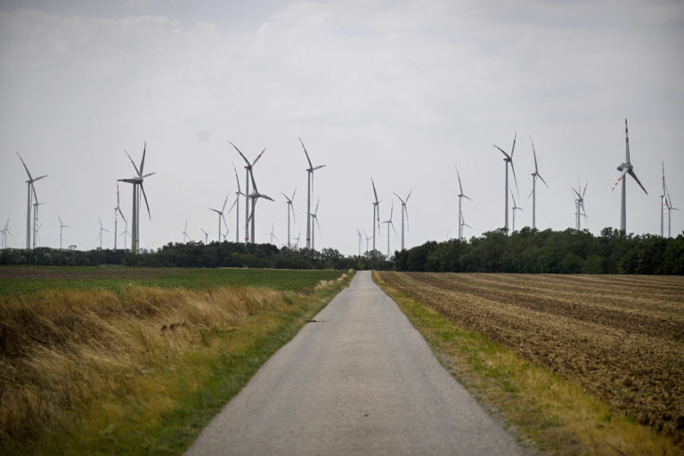 Veterné turbíny v rakúskej obci Prellenkirchen počas presstripu pre novinárov organizovaného spoločnosťou Slovenský plynárenský priemysel (SPP), na ktorom informovali o prínose veternej energie a pláne vybudovať veterné parky na Slovensku. Prellenkirchen, Rakúsko, 21. august 2024. Foto: SITA/Milan Illík