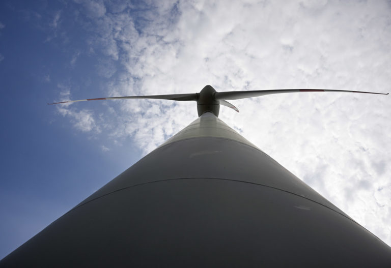 Veterná turbína v rakúskej obci Prellenkirchen počas presstripu pre novinárov organizovaného spoločnosťou Slovenský plynárenský priemysel (SPP), na ktorom informovali o prínose veternej energie a pláne vybudovať veterné parky na Slovensku. Prellenkirchen, Rakúsko, 21. august 2024. Foto: SITA/Milan Illík