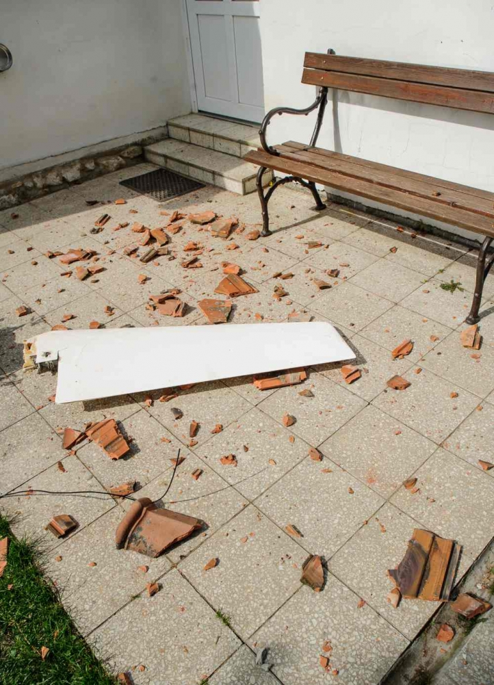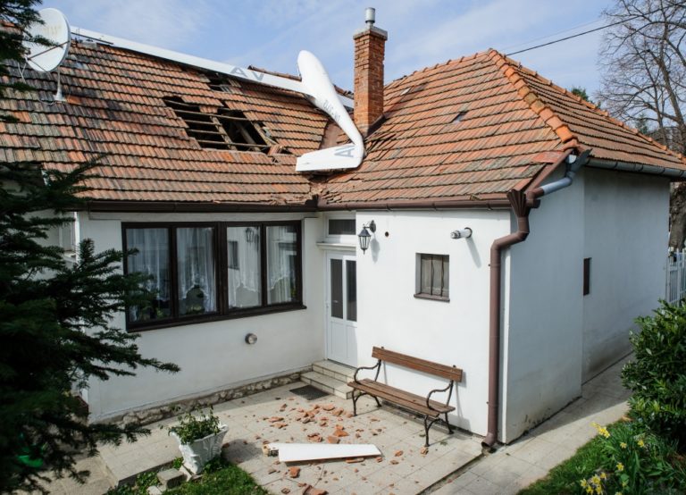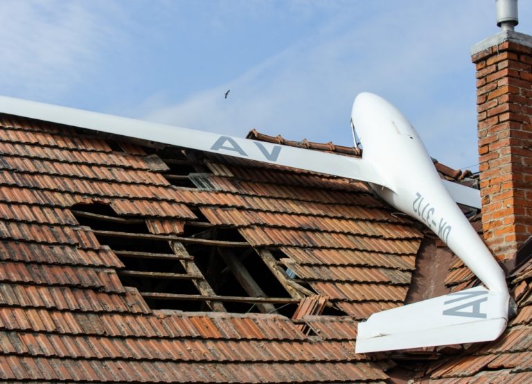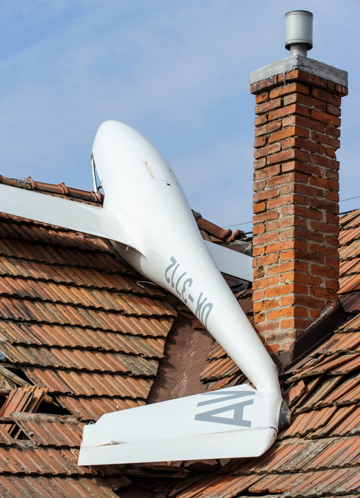 Časť bezmotorového lietadla, ktoré spadlo na strechu rodinného domu na Zobore v Nitre. Pilot sa stihol katapultovať ešte pred dopadom vetroňa. Nitra, 2. apríl 2016. Foto: SITA/Martin Havran